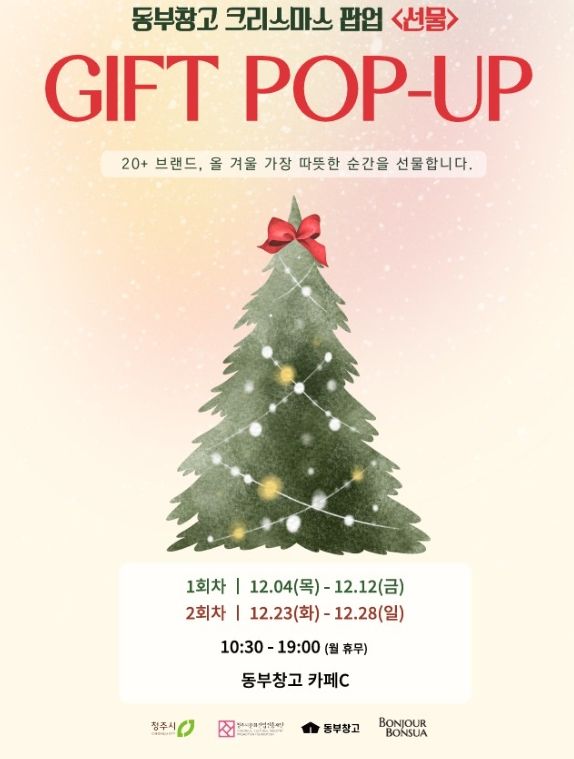 청주시와 청주시문화산업진흥재단은 오는 4~12일, 23~28일 두 차례에 걸쳐 동부창고 카페C에서 크리스마스 연말 기프트 팝업 ‘선물’을 개최한다.