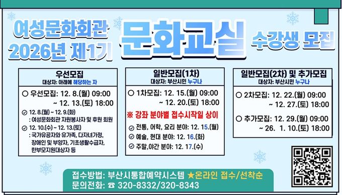 [참좋은뉴스= 기자] 부산시 여성문화회관은 오는 내일(8일)부터 '2026년 제1기 문화교실' 수강생을 모집한다고 밝혔다.