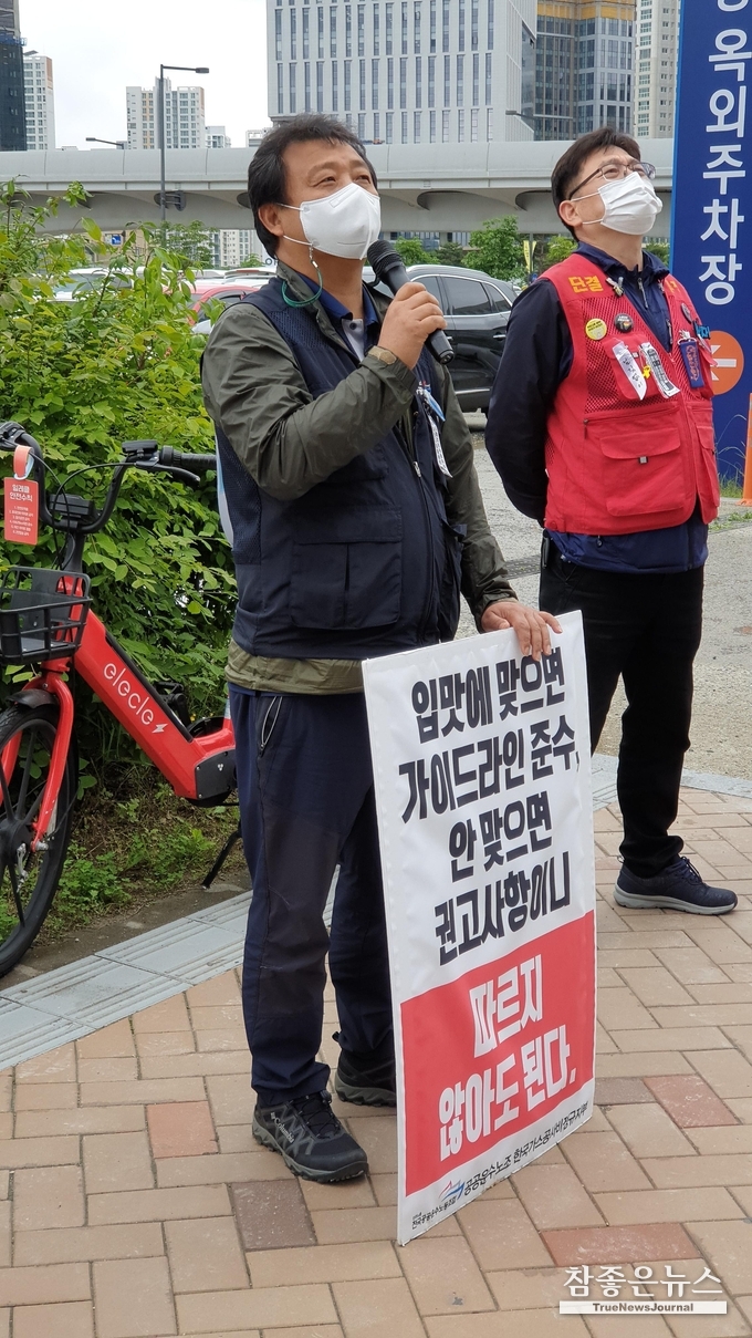 투쟁기금 전달 후 점심 선전전에 돌입한 이준형 본부장은 발언을 통해 “산자부는 한 번 생각해 보라”며 “한국가스비정규직 노동자들이 가스공사 사장이 바뀌는 과정에서 정규직 전환을 못 했던 거 알고 계실 것이다. 가스공사 사장을 하다가 산자부 국장으로 자리를 옮긴 그 인물이 임기 중에 임무를 내팽개치고 산자부 안으로 들어 왔다. 자기 일도 못 하는 사람이 어떻게 산자부 안에 들어 와서 일을 하는지 도저히 이해가 가지 않는다”고 질타했다.