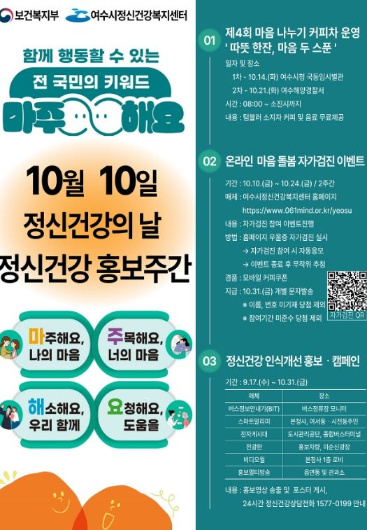 [참좋은뉴스= 기자] 여수시는 정신건강의 날(10월 10일)을 기념해 10월 10일부터 24일까지 ‘2025년 정신건강 홍보주간’을 운영한다.