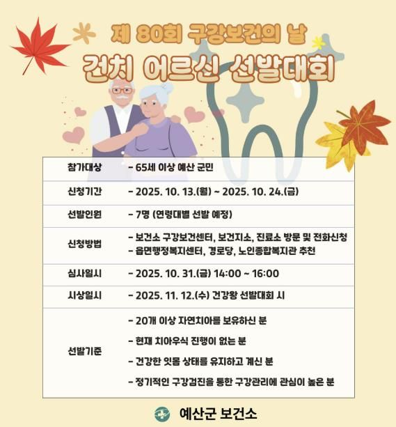 [참좋은뉴스= 기자] 예산군보건소는 ‘제80회 구강보건의 날’을 맞아 건강하고 활기찬 구강생활 실천 분위기 조성을 위해 건치(건강한 치아)어르신 선발대회를 개최한다.