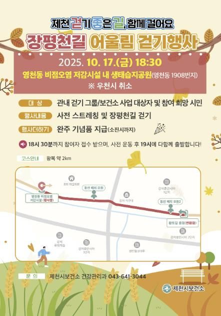 [참좋은뉴스= 기자] 제천시보건소가 관내 걷기 그룹 활성화와 시민 건강 증진을 위한 장평천길 어울림 걷기 행사를 오는 17일 저녁 6시 30분에 개최한다고 밝혔다.