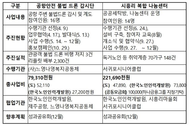 제주도는 일자리 수 확대와 함께 어르신 전문성과 지역 특성을 살린 특화사업 발굴에 주력하고 있다. 2023년부터 매년 자체 예산 1억 원을 투입해 한국노인인력개발원 제주지역본부와 협약을 맺고 신규 직무를 지속 개발 중이다.