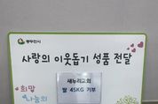 [참좋은뉴스= 기자] 동두천시 불현동 새누리교회는 11월 3일 불현동 행정복지센터에 백미 45kg을 전달했다고 밝혔다. 새누리교회는 불현동에 위치한 개신교 교단으로, 매년 나눔을 실천하며 지역사회에 따뜻한 온정을 나누고 있다. 민경엽 담임목사는 “지역의 소외된 이웃들이 추운 겨울 따뜻한 연말을 보낼 수 있길 바란다”며 “작은 정성이지만 도움이 됐으면 좋겠다”라고 전했다. 김영미 불현동장은 “지역사회를 위해 꾸준히 나눔을 실천해 주신 데 감사드리며, 후원해 주신 백미는 도움이 필요한 취약계층에 소중히 전달하겠다”라고 말했다. [뉴스출처 : 경기도 동두천시]