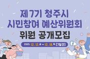 [참좋은뉴스= 기자] 청주시는 시민참여예산제의 효율적인 운영과 활성화를 위해 오는 18일까지 제7기 청주시 시민참여예산위원 14명을 공개모집한다. 시민참여예산위원회는 예산에 대한 시민들의 의견을 수렴·집약하고 수립 과정에 참여해 예산안에 대한 의견을 제출하는 기능을 수행한다. 시민이 제안한 사업에 대한 우선순위 결정, 추진 결과 점검 등 과정 전반에 직접 참여하게 된다. 이번 공개모집 인원은 14명으로 읍·면 8명, 동 6명이다. 임기는 2026년 1월 1일부터 2027년 12월 31일까지 2년간이다. 신청 자격은 청주시에 주민등록이 되어 있거나 청주시에 영업소 본점 또는 지점을 둔 사업체의 대표자・임직원, 청주시 소재 기관·단체에 근무하는 사람 등이다. 세금 및 과태료 체납자는 신청할 수 없다. 신청은 시 누리집 고시공고에서 신청서를 내려받아 18일까지 시 예산과, 구청 행정지원과, 읍·면·동 행정복지센터에 방문하거나 이메일, 우편 등을 통해 제출하면 된다. 시는 연말까지 선정해 개별통지할 계획이다. 시 관계자는 “투명하고 효율적인 예산운영을 위