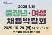 [참좋은뉴스= 기자] 인천광역시는 중장년과 여성의 새로운 일자리 도전과 사회 참여 확대를 지원하기 위해 오는 10월 28일 인천시청 중앙홀에서 ‘2025 인천 중장년·여성 채용박람회’를 개최한다고 밝혔다. 이번 박람회는 올해 다섯 차례 진행된 ‘2025 인천 상설 채용박람회’의 마지막 일정으로, 인천시와 성평등가족부, 중부지방고용노동청 등 10개 기관이 공동으로 주최한다. 이번 행사에는 33개 기업이 참여해 현장 면접을 진행하고, 구직자들에게 실질적인 취업기회를 제공할 예정이다. 또한 채용관 외에도 ▲이력서 사진 촬영 ▲퍼스널컬러 진단 ▲인공지능(AI) 캐리커처 제작 등 구직자의 이미지 개선과 취업 경쟁력 향상을 위한 다양한 체험프로그램이 함께 운영된다. 연계행사로는 대회의실에서 ‘여성의 취·창업 역량 강화’를 위한 특별강연이 오전·오후로 두 차례 나뉘어 진행된다. 오전 1차 특강에서는 개그맨 출신 사업가 고명환이 강사로 나서 중장년층의 창업 전환을 주제로 실질적인 경험과 노하우를 전달하고, 오후 2차 특강에서는 과학 유튜버‘궤도’가 디지털 리터러시 향상과 인공지능(AI)을 활용한 구