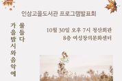 [참좋은뉴스= 기자] 금산인삼고을도서관은 프로그램 수강생들의 학습 성과물에 대한 성취감 고취와 지역 주민 문화 향유 기회 제공을 위해 오는 30일 금산읍 청산회관에서 ‘가을밤, 시와 음악에 물들다’ 행사를 개최한다. 이날 도서관 독서문화프로그램 ‘시와 함께 소리 찾기’ 수강생 시 낭송 공연 및 문화예술동아리 지원사업으로 운영 중인 금산만돌린챔버 수강생 만돌린 공연 등이 개최된다. 또한, 박인숙 인문학 강사의 ‘시를 노래하다’ 특강이 펼쳐진다. 금산인삼고을도서관 ‘가을밤, 시와 음악에 물들다’ 행사에 관한 자세한 내용은 금산다락원 도서관팀에 문의하면 된다. 도서관 관계자는 “2021년 이후 만 4년 만에 개최되는 발표회를 열게 됐다”며 “그동안 프로그램 참여를 통해 기량을 익힌 수강생들의 성과를 보여주는 자리가 될 것”이라고 말했다. [뉴스출처 : 충청남도금산군]