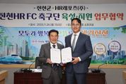 [참좋은뉴스= 기자] 충북 진천군은 군청 소회의실에서 HR레포츠 주식회사(대표 신호룡)와 ‘진천 HR FC 축구단 육성 및 지원을 위한 업무협약’을 체결했다고 24일 밝혔다. 이번 협약은 2026년 대한축구협회 K4 리그 참가를 앞두고, 진천 HR FC의 안정적인 운영 기반을 마련하고, 지역 스포츠 발전을 위한 협력 체계를 구축하기 위해 추진됐다. 협약식에는 송기섭 진천군수와 HR레포츠(주) 신호룡 대표, 김화영 진천군 체육회장, 김중기 진천군 축구협회장 등 관계자들이 참석했다. 협약의 주요 내용은 △축구단 운영과 발전 지원 △유소년 축구 육성과 저변 확대 △지역사회 공헌 활동 △스포츠마케팅을 통한 지역 홍보 강화 등이다. 군은 이번 협약을 통해 지역 스포츠 브랜드 가치 제고, 군민 스포츠 관람 문화 정착, 유소년·생활 체육 연계 강화 등 다양한 효과를 기대하고 있다. 앞으로 군은 행정적·재정적 지원과 경기장 관련 시설 활용 지원 등에 협력하고, HR 레포츠는 선수단 운영, 스포츠마케팅, 유소년 프로그램 운영 등을 총괄하며 지역 축구 문화 확산에 힘쓸 예정이다. 송기섭