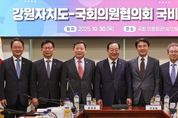 [참좋은뉴스= 기자] 김진태 강원특별자치도지사는 10월 30일 오후 2시, 국회 의원회관에서 도내 지역구 국회의원 7명과 함께 도 국회의원협의회를 열고 2026년도 국비 추가 확보 방안 등을 논의했다. 이번 간담회는 2026년도 정부예산안의 국회 심의가 본격화되는 시점에 맞춰 도와 지역 국회의원 간 협력체계를 강화하기 위해 마련된 자리로, 김 지사를 비롯해 지역구 국회의원 보좌진이 참석해 예산 확보 전략을 중심으로 실무적인 논의를 진행했다. 이 자리에서 도는 올해 국비 10조 원 시대를 처음으로 연 성과를 바탕으로 정부 예산안에 미반영된 24개 사업(총 612억 원)의 국비 추가 확보 방안을 논의하고, 해당 사업들이 국회 심의 과정에서 반드시 반영될 수 있도록 국회의 적극적인 협력을 요청했다. 이와 함께 ▲용문~홍천 광역철도 예타 통과 ▲삼척~강릉 고속화철도 예타 통과 ▲포천~철원 고속도로 예타 통과 ▲소양8교 건설 국비 반영 ▲제5차 국가철도망 구축계획 및 제6차 국도‧국지도 건설계획 최대 반영 등 강원지역 주요 에스오시(SOC) 현안과제에 대해서도 폭넓은 논의가 이뤄졌다. 한기호 국회의원(강원