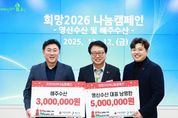 [참좋은뉴스= 기자] 울진군은 지난 12월 12일‘희망2026 나눔캠페인’을 통해 영신수산 남영한 대표로부터 성금 500만원과 해주수산 권일재 대표로부터 성금 300만원을 각각 기탁받았다. 희망2026 나눔캠페인은 지역 내 어려운 이웃을 돕기 위한 성금모금 캠페인으로, 기탁된 성금은 관내 저소득층과 사각지대 해소를 위해 사용될 예정이다. 영신수산 남영한 대표와 해주수산 권일재 대표는 매년 울진 지역의 어려운 이웃을 위해 꾸준한 나눔 활동을 이어오고 있으며, 이번 기탁과 관련해“지역사회에 조금이나마 보탬이 되기를 바라는 마음으로 성금을 기탁하게 됐다”며“앞으로도 다양한 사회공헌 활동을 통해 지역에 이바지하고 싶다”라고 전했다. 울진군 관계자는“어려운 경제 여건 속에서도 꾸준히 이웃 사랑을 실천해주고 계신 기탁자들께 깊이 감사드린다”며“기탁된 성금은 꼭 필요한 곳에 투명하고 소중하게 사용하겠다”라고 말했다. [뉴스출처 : 경상북도 울진군]