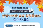 [참좋은뉴스= 기자] 파주보건소는 시민들의 건강한 삶을 위한 한의약 건강 증진 프로그램인 ‘한방이어락(樂) 숲속 치유교실(힐링 클래스)’을 오는 25일 10시부터 12시까지 율곡수목원에서 운영한다. 이번 프로그램은 자연 속에서 가족이 함께 건강을 되돌아보고, 숲에서의 명상과 호흡을 통해 스트레스를 해소하고자 기획됐다. 참가자들은 수목원의 맑은 공기와 아름다운 풍경 속에서 지친 몸과 마음을 회복하는 시간을 갖게 된다. 주요 내용은 ▲구절초 숲길 산책 ▲자연 속에서 가족과 추억 만들기 ▲구절초 차 마시기 등 구절초를 주제로 한 다양한 활동으로 구성되어 있다. 신청은 파주시 평생교육포털 누리집(lll.paju.go.kr)을 통해 가능하며, 가족 단위로(4~6가구, 총 20여 명) 선착순 모집한다. 단, 신청 가구가 많을 경우 3대 가족을 우선 선발한다. 이한상 파주보건소장은 “자연과 함께하는 치유 프로그램을 통해 가족 간 유대감을 높이고, 건강한 생활 습관을 기를 수 있는 계기가 되길 바란다”라며 “많은 시민들의 적극적인 참여를 기대한다”라고 밝혔다. [뉴스출처 : 경기도 파주시]