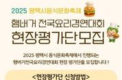 [참좋은뉴스= 기자] 평택시는 오는 25일 농업생태원에서 ‘2025 평택시 음식문화축제’를 통해 ▲전국 요리경연대회 ▲평택 지역 맛집 및 세계음식 시식·체험관 ▲노 오븐 베이킹 체험관 ▲탄소중립 실천·홍보관 등 다채로운 부스가 운영돼 시민들에게 풍성한 경험을 선사할 예정이다. 전국 요리경연대회는 ‘평택의 맛, 나만의 아이디어로 버거를 완성하다’를 주제로 총 18팀(일반부 10, 가족부 8)이 본선에 진출해 열띤 경연을 펼친다. 지난해와 달리 참가 부문이 일반부와 가족부로 확대됐으며, 시상 규모도 10팀 740만 원으로 늘어나 큰 기대를 모으고 있다. 경연대회의 생생한 현장을 함께할 시민 현장평가단도 사전 모집한다. 10월 24일(금) 오전 9시부터 오후 5시까지 일반부와 가족부 각 20명씩 무작위로 선착순 접수받으며, 편식 없는 고등학생 이상이라면 누구나 신청할 수 있고, 선정된 지원자는 실제 경연 현장에서 요리를 맛보고 평가하게 된다. 또한, 오전 10시에는 빵과당신 인재홍(대한민국 제과명장)이 진행하는 베이킹 체험이 마련돼 있으며, 참가 신청은 24일(금) 오전 10시부터 평택예총 공식 블로그 및 평택시청
