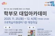 [참좋은뉴스= 기자] 구로구가 예비 수험생 학부모를 대상으로 ‘2027학년도 학부모 대입 아카데미’를 운영한다. 구는 변화하는 대입 제도와 입시 환경 속에서 학부모가 정확한 정보를 이해하고, 자녀의 진로·진학을 체계적으로 지원할 수 있도록 매년 학부모 대입 아카데미를 운영하고 있다. 교육은 구로구 관내 예비 수험생(중학교 3학년∼고등학교 2학년)을 둔 학부모 50명을 대상으로 구로학습지원센터 1관 대강의실에서 진행된다. 이번 프로그램은 △11월 25일 ‘고교학점제 대비 및 2028학년도 대입 제도 분석’ △11월 27일 ‘학종 성공을 위한 과목 선택과 내신 1등급 만들기 공부 비법’ △12월 2일 ‘2027학년도 대입 전형의 이해와 수시모집 성공전략 세우기’ △12월 4일 ‘주제탐구활동을 하면 학생부가 왜 특별해 보일까?’ 등 총 4회에 걸쳐 매회 오후 7시부터 9시까지 2시간 동안 이어진다. 강의는 진학 멘토 ‘신의 한 수’ 입시전략연구소 김용택 대표가 나서 학부모가 자녀와 함께 실천할 수 있는 현실적인 진학 지도 방안과 대입 준비에 필요한 핵심 정보를 전달할 예정이다. 참여를 원하