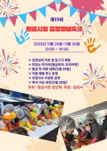 [참좋은뉴스= 기자] 김천시에서는 오는 29일~30일 황금동 한신로 일원에서 ‘제19회 황금시장 김장양념축제’를 개최한다고 밝혔다.