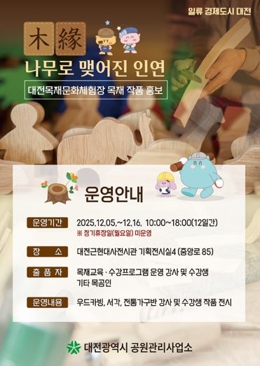 [참좋은뉴스= 기자] 대전시는 공원관리사업소(목재문화체험장) 주관으로 12월 5일부터 16일까지 대전근현대전시관 기획전시실에서 목재교육·수강 프로그램에 참여한 강사와 수강생들의 작품 80여 점을 특별전시한다.