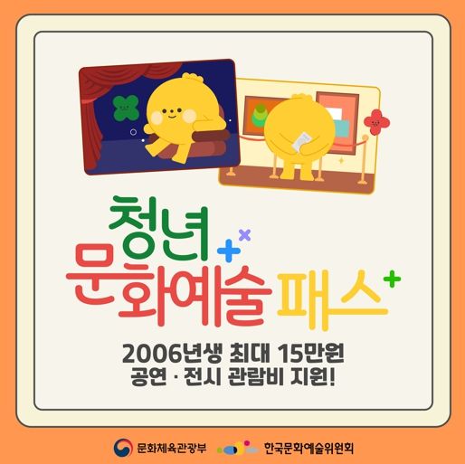 청년문화예술패스는 19세가 되는 청년들에게 공연과 전시 예매에 최대 15만 원을 지원해주는 사업으로, 청년들에게는 문화 향유의 기회를 제공하고 문화예술인들에게는 창작과 실연의 기회를 넓혀 문화시장 활성화를 도모하는 사업이다.