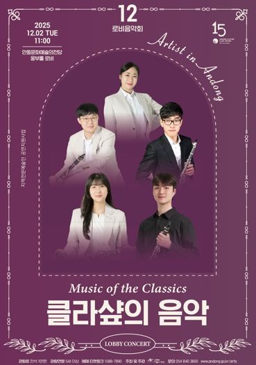 [참좋은뉴스= 기자] 안동문화예술의전당은 지역예술인들에게 다양한 무대 경험을 제공하고, 시민에게는 일상 속 음악 향유할 수 있는 기회를 마련하고자, 매월 첫째 주 화요일 오전 11시에 로비음악회 시리즈를 진행하고 있다. 올해 마지막 로비음악회는 ‘클라샵’의 공연으로 12월 2일 오전 11시, 웅부홀 로비에서 '클라샾의 음악'이라는 제목으로 개최된다.