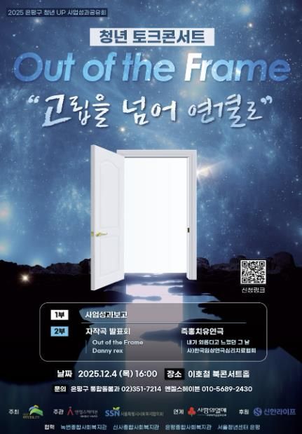 [참좋은뉴스= 기자] 서울 은평구는 내달 4일 은둔형 외톨이 지원사업의 성과를 공유하고 고립·은둔 청년들의 회복 이야기를 공연으로 담아낸 ‘청년 토크콘서트, Out of the Frame’을 개최한다고 밝혔다.