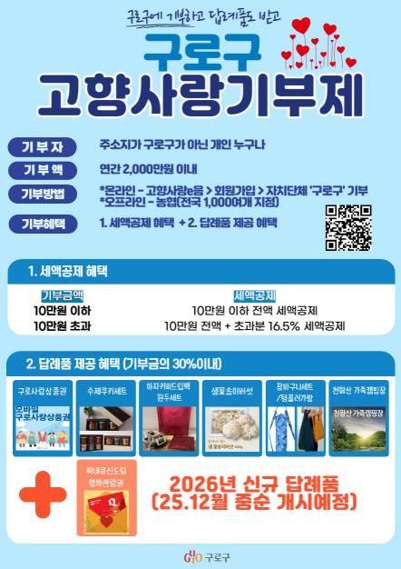 기부금은 연간 2천만원 한도 내에서 가능하며, 10만원까지는 전액(100%), 10만원 초과분은 16.5%의 세액공제 혜택을 받을 수 있으며, 기부 금액의 30% 상당의 구로구 답례품도 제공된다.