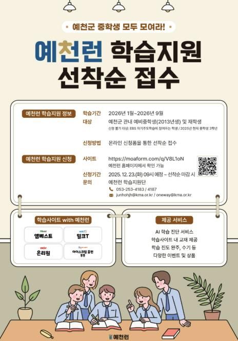 [참좋은뉴스= 기자] 예천군은 지역 청소년의 학습격차 해소와 자기주도학습 역량 강화를 위해 추진 중인 AI 기반 학습지원 사업 ‘예천런’에 참여할 예비 중학교 1학년 및 재학생을 추가 모집한다.