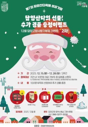 먼저 오는 28일까지 10만 원 이상 기부자 중 100명을 무작위 추첨해 담양한우, 쌀 등 지역 특산품을 증정하는 ‘담양산타의 선물 이벤트’가 진행된다.