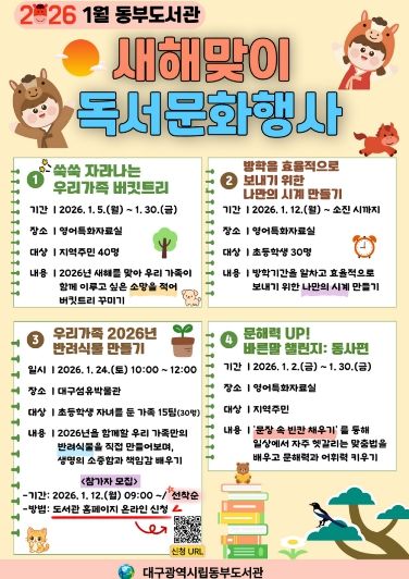 [참좋은뉴스= 기자] 대구동부도서관은 다가오는 새해를 맞아 지역주민이 도서관에서 뜻깊은 한 해를 시작할 수 있도록 1월 한 달간 동부도서관 ‘새해맞이 특별 독서문화행사’를 운영한다.