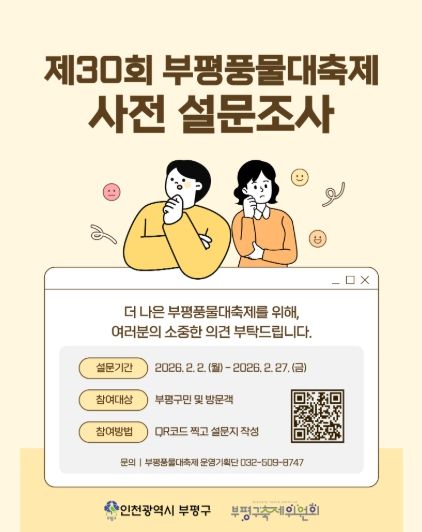 [참좋은뉴스= 기자] 부평구 축제위원회는 올해 30회를 맞는 부평풍물대축제의 내실 있는 종합계획 수립과 성공적인 개최를 위한 사전 설문조사를 실시한다고 밝혔다.