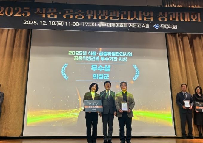 [참좋은뉴스= 기자] 의성군은 지난 18일 경상북도가 주관한 ‘2025년 식품·공중위생 분야 평가’에서 두 개 부문에서 동시에 우수상을 수상했다.