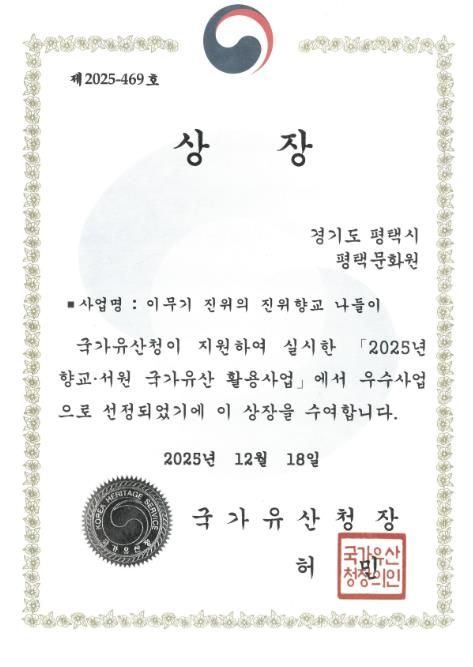 [참좋은뉴스= 기자] 평택문화원은 12월 18일 대전 전통나래관 다목적강당에서 열린 국가유산청 주최 ‘2025 우리고장 국가유산 활용 우수사업 시상식’에서 평택문화원의 ‘이무기 진위의 진위향교 나들이’가 우수사업(국가유산청장상)으로 수상했다.