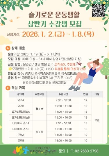 [참좋은뉴스= 기자] 광명시 광명건강생활지원센터는 새해를 맞아 시민들의 건강한 생활습관 형성과 만성질환 예방을 위해 2026년 상반기 ‘슬기로운 운동생활’ 운동 프로그램 참여자를 모집한다.