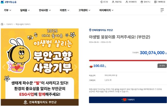 [참좋은뉴스= 기자] 부안군은 고향사랑기부제 지정기부 ESG 사업으로 추진한 ‘야생벌 붕붕이를 지켜주세요!’ 프로젝트가 기부자들의 꾸준한 참여 속에 목표 모금액 3억원을 달성했다고 밝혔다.