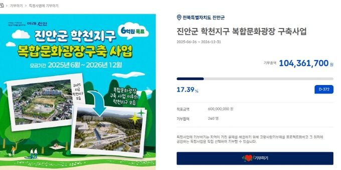[참좋은뉴스= 기자] 진안군이 고향사랑기부제 지정기부사업으로 지난 6월부터 추진 중인 “학천지구 복합문화광장 구축사업”이 모금 시작 6개월 만에 누적 모금액 1억 원을 달성했다.