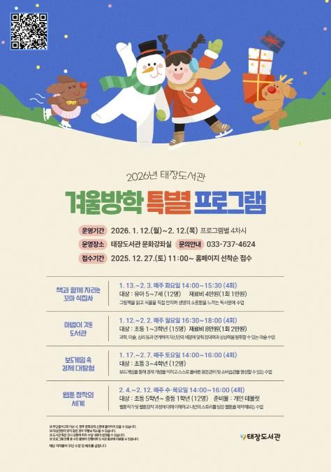 [참좋은뉴스= 기자] 원주시 태장도서관은 겨울방학을 맞아 1월 12일부터 2월 12일까지 겨울방학 특별 프로그램을 운영한다.