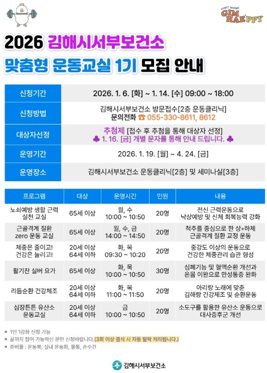 [참좋은뉴스= 기자] 김해시서부보건소에서 1월 6일부터 14일까지 『2026년 맞춤형 운동교실 1기』 신규 참여자를 모집한다.