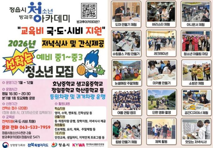 [참좋은뉴스= 기자] 정읍시와 성평등가족부가 지원하는 정읍시 청소년방과후아카데미가 지역 청소년들의 건강한 성장과 역량 개발을 돕기 위해 2026년도 신입생 모집에 나섰다.
