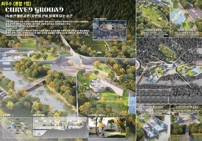 최우수 작품은 세 개의 벽을 통해 입체적 공간을 구성한 ‘CURVED GROUND’가 선정됐다. 이어 공간디자인 부문 우수상에는 고현천의 물길을 형상화한 ‘유담림’, 장려상에는 몽돌을 층층이 쌓아올린 석탑 ‘몽돌루’가 선정됐다.