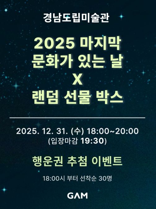 [참좋은뉴스= 기자] 경남도립미술관은 12월 31일 ‘문화가 있는 날’을 맞이해 연말을 함께 즐길 수 있는 특별 이벤트를 마련한다고 밝혔다.