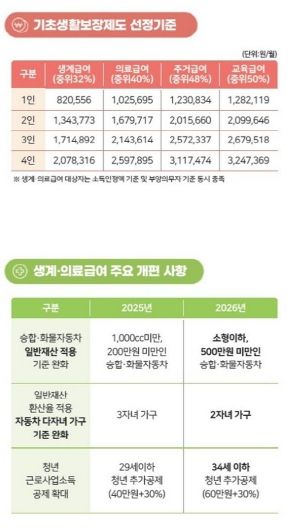 2026년 1인 가구의 중위소득은 2025년 239만 2013원 대비 7.20% 인상된 256만 4238원으로 기초생활보장 수급 가구의 대다수를 차지하는 1인 가구 대상에는 보다 높은 인상률이 적용됐으며, 생계급여 선정기준은 1인 가구 5만 5000원, 4인 가구 12만 7000원 인상돼 생활 수준이 향상될 것으로 기대된다.