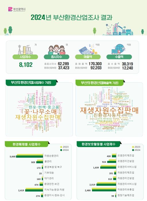 부산의 환경산업이 지난 5년간 규모 면에서 사업체(34.9% 증가)와 고용(29.0% 증가)이 크게 늘었을 뿐만 아니라, 사업체당 매출액이 11.38억 원으로 2020년(8.98억 원)보다 26.7퍼센트(%) 증가하는 등 질적 성장도 이룬 것으로 나타났다.