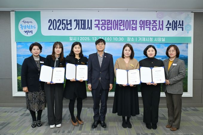 [참좋은뉴스= 기자] 거제시는 12월 31일, 시장실에서 국공립어린이집 수탁자로 선정된 어린이집에 위탁계약증서를 수여했다.