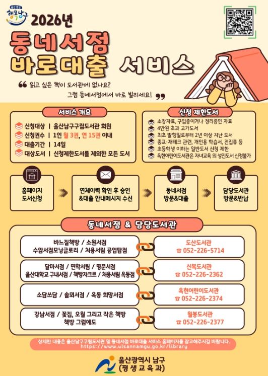[참좋은뉴스= 기자] 울산 남구는 2026년 ‘동네서점 바로대출’서비스를 2일부터 운영한다.