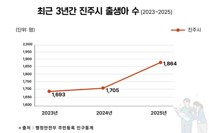 지난 5일 행정안전부의 주민등록 인구통계 발표에 따르면 진주시의 주민등록 출생아 수는 2023년 1693명으로 저점을 찍은 후, 2024년 1705명, 2025년 1864명으로 뚜렷한 증가세를 보였다.