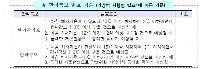 한파특보 중 ‘한파주의보’는 아침 최저기온이 전날보다 10℃ 이상 하강하여 3℃ 이하이면서 평년값보다 3℃ 이상 낮을 것으로 예상되거나 아침 최저기온이 전날보다 12℃ 이하인 날이 2일 이상 지속될 것으로 예상될 때 발효된다.