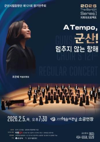 [참좋은뉴스= 기자] 군산시립합창단이 제121회 정기연주회 〈2026 The Barton Series Ⅰ 지휘자 프로젝트〉 A Tempo, 군산! '멈추지 않는 항해'를 오는 2월 5일 저녁 7시 30분, 군산예술의전당 소공연장에서 개최한다.