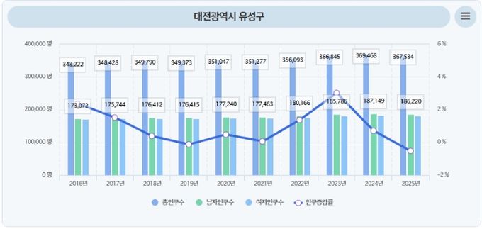 행정안전부 주민등록 인구통계 분석 결과, 유성구 인구는 10년 전인 지난 2016년(이하 12월 31일 기준) 34만 3,222명에서 2025년에는 36만 7,534명으로 2만 4,312명이 증가(증가율 7.1%)했다.