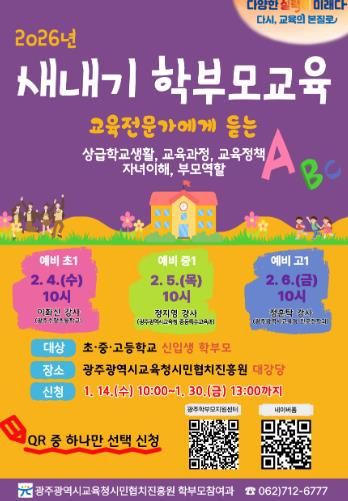 [참좋은뉴스= 기자] 광주시교육청시민협치진흥원은 오는 2월 4~6일 본원 대강당에서 초·중·고등학교 신입생 학부모를 대상으로 ‘2026년 새내기 학부모교육’을 운영한다.