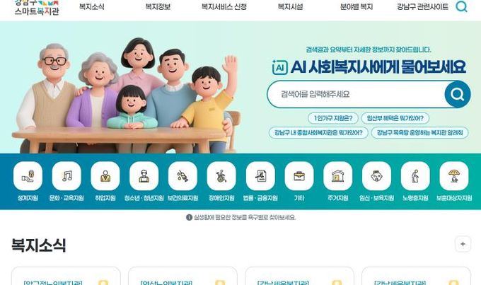 [참좋은뉴스= 기자] 꿈이 모이는 도시, 미래를 그리는 강남구가 2024년 7월 구축한 통합 복지플랫폼 ‘강남구 스마트복지관’의 검색·상담 기능을 고도화했다. 구는 고도화된 서비스를 올해부터 새롭게 운영한다.