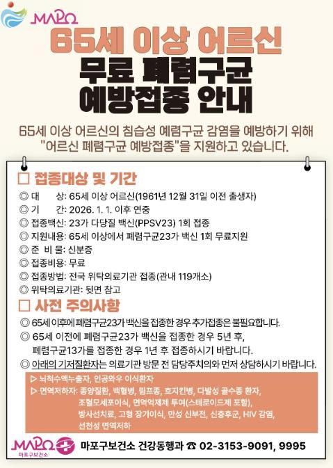 [참좋은뉴스= 기자] 마포구는 65세 이상 어르신의 침습성 폐렴구균 감염을 예방하고 건강한 노후를 지원하기 위해 연중 ‘어르신 폐렴구균 예방접종’을 1회 무료로 실시한다.