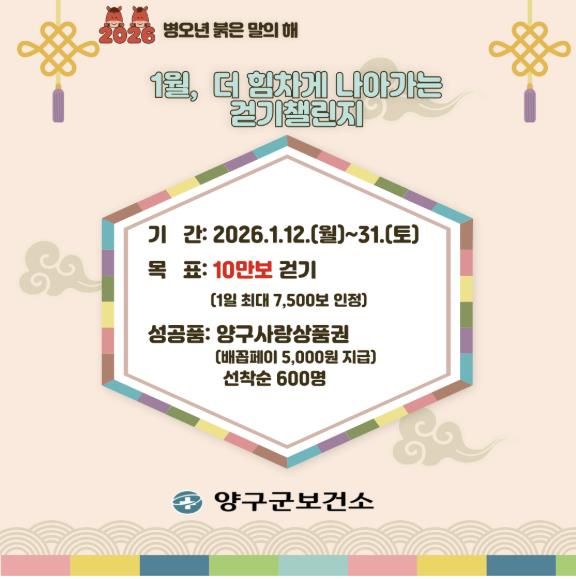 양구군은 1월부터 ‘워크온 걷기 챌린지’를 운영하며, 다양한 걷기 행사와 참여형 챌린지를 지속적으로 추진할 예정이다. 1월에는 목표 걸음 10만 보 이상, 2월부터 11월까지는 매달 목표 걸음 20만 보 이상을 걷는 주민에게 양구사랑상품권(배꼽페이) 5000원을 지급한다. 챌린지 기간 동안 하루 최대 7500보까지 인정되며 선착순 600명에게 지급한다.