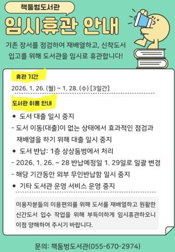 [참좋은뉴스= 기자] 고성군이 운영하는 책둠벙도서관은 신규 장서 확충과 기존 장서 정비를 위해 2026년 1월 26일부터 28일까지 3일간 임시 휴관한다.
